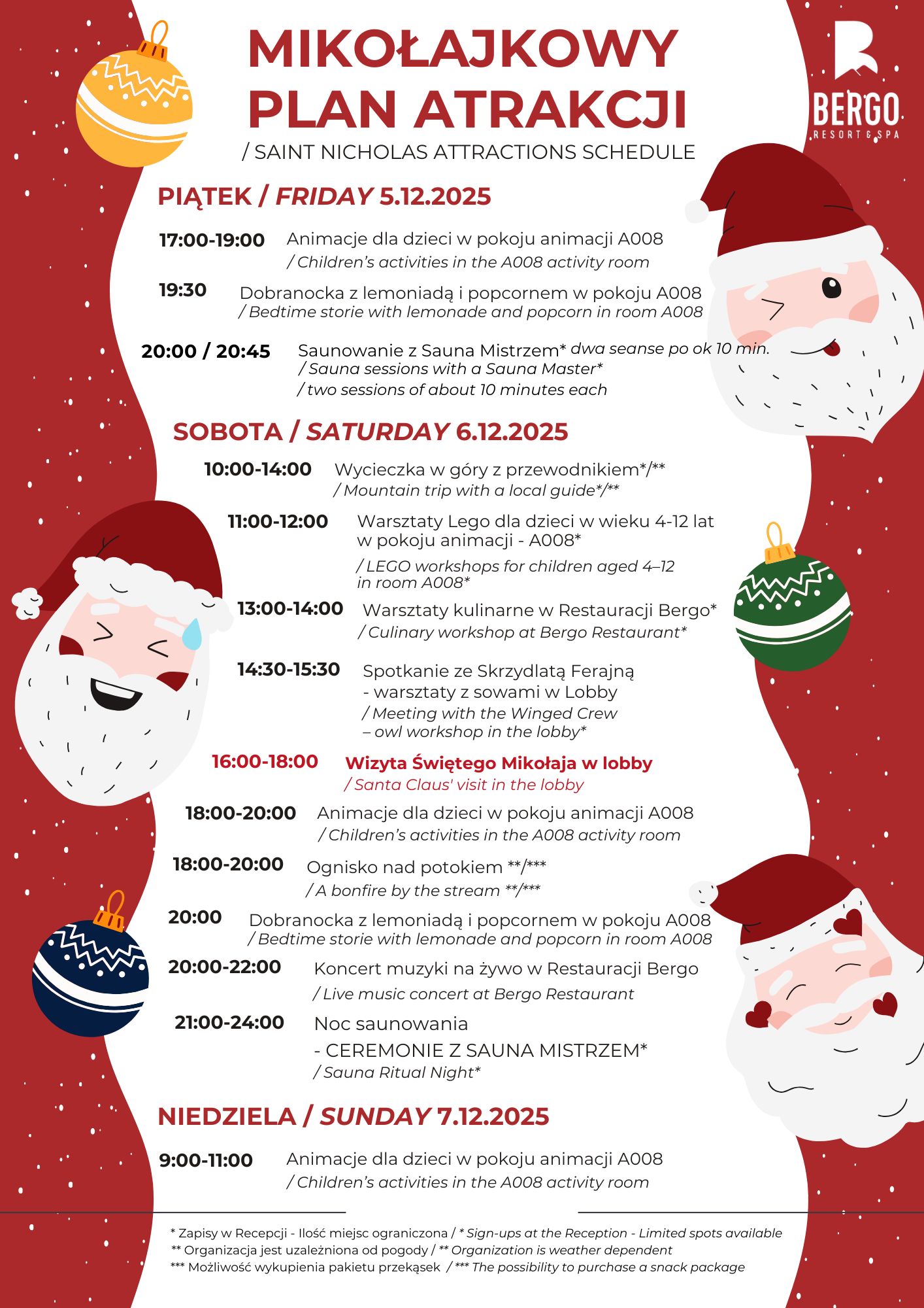 10:00 - 14:00 - WYCIECZKA W GÓRY Z PRZEWODNIKIEM 11:00 - 12:00 - WARSZTATY LEGO DLA DZIECI 13:00 - 14:00 - WARSZTATY KULINARNE DLA DZIECI 14:30 - 15:30 - WARSZTATY Z SOWAMI 16:00 - 18:00 - WIZYTA ŚWIĘTEGO MIKOŁAJA 18:00 - 20:00 - ANIMACJE DLA DZIECI 18:00 - 20:00 - OGNISKO NAD POTOKIEM 20:00 - MIKOŁAJKOWA DOBRANOCKA 20:00 - 22:00 - MUZYKA NA ŻYWO W RESTAURACJI BERGO 21:00 - 24:00 - NOC SAUNOWANIA